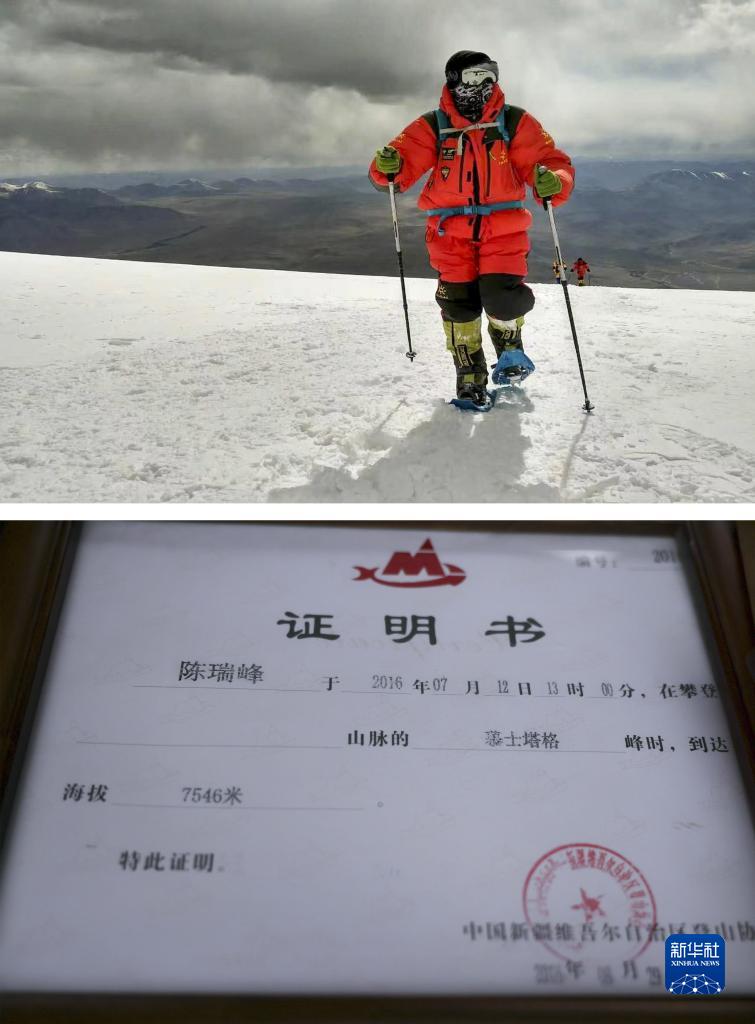 拼版照片:上圖為陳瑞峰在2016年7月攀登海拔7500多米的慕士塔格峰時(shí)的留影(受訪(fǎng)者供圖);下圖為2022年6月14日翻拍的陳瑞峰登頂慕士塔格峰證書(shū)(新華社記者 胡虎虎 攝)。新華社發(fā)