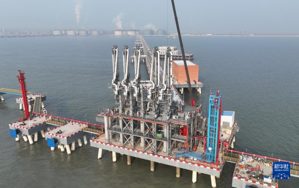 1月4日,工人在唐山市曹妃甸區新天LNG(液化天然氣)項目接收站碼頭施工(無(wú)人機照片)。