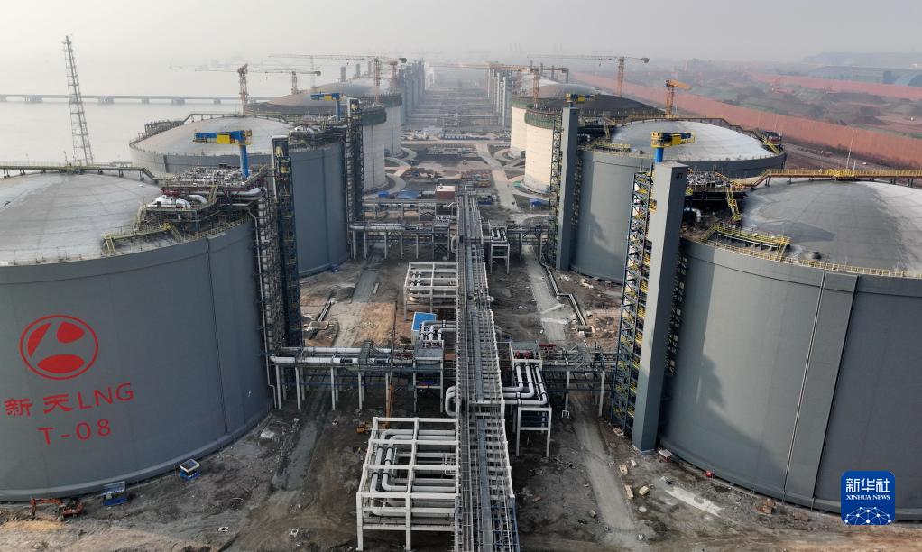 1月4日拍攝的唐山市曹妃甸區新天LNG(液化天然氣)項目接收站工程建設工地(無(wú)人機照片)。
