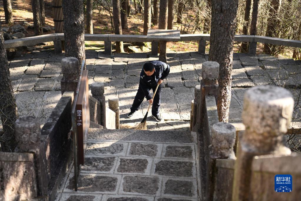 4月21日,在黃山風(fēng)景區平天矼瞭望哨門(mén)口,秦志平在打掃山道。