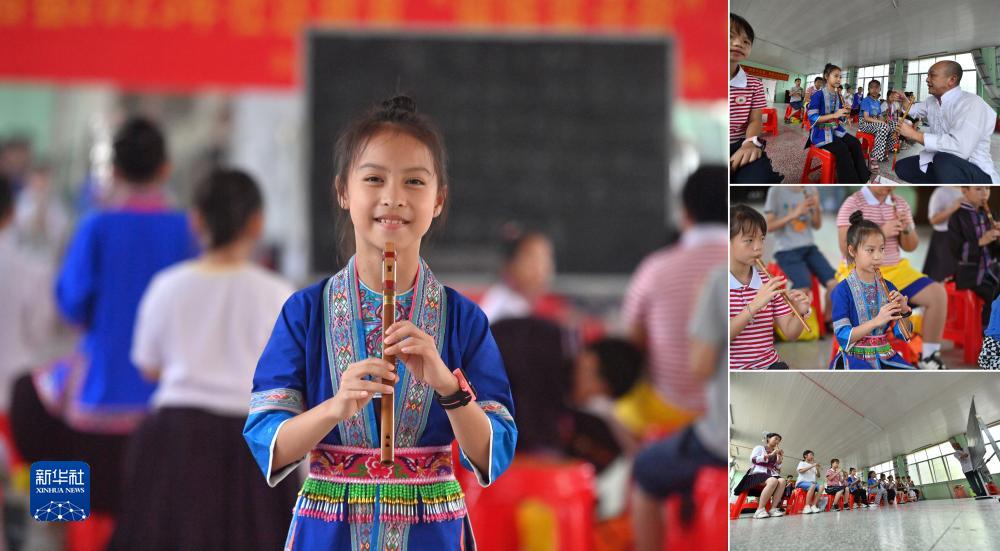 拼版照片:左圖為廣西三江侗族自治縣10歲的小學(xué)生石金晶;右圖為石金晶在縣文化館非遺公益培訓班上學(xué)習吹侗笛(照片均攝于7月13日)。暑假期間,三江侗族自治縣文化館舉辦侗笛公益培訓班,喜歡吹奏侗族樂(lè )器的石金晶報名參加。