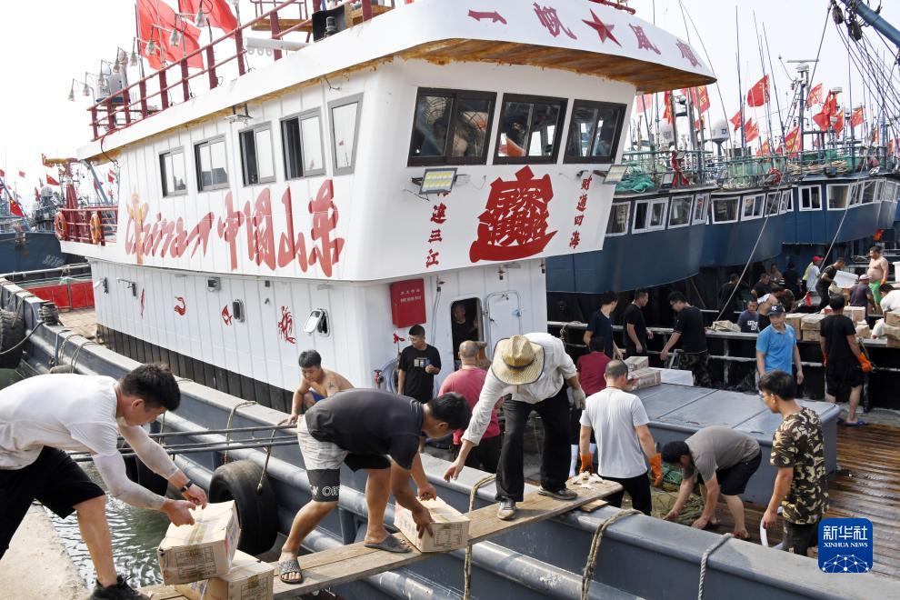 9月1日,在山東省青島西海岸新區的積米崖中心漁港,漁民們在出海前進(jìn)行最后的物資補給。